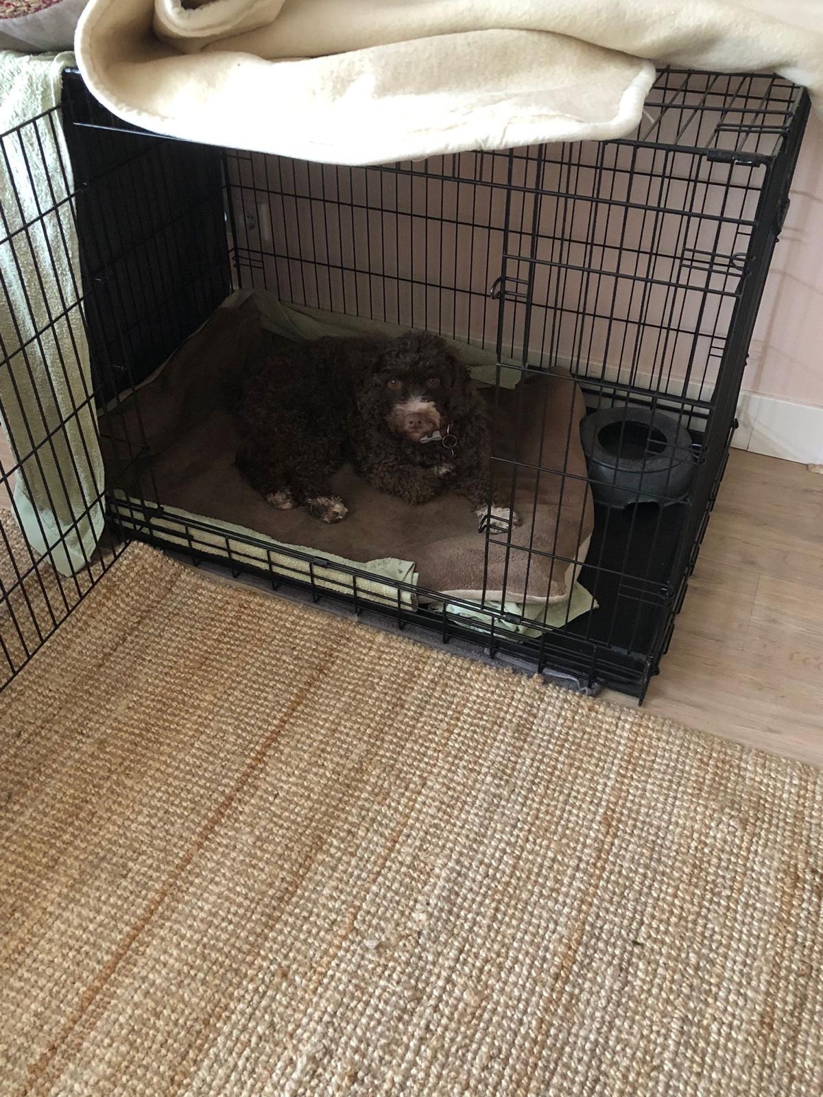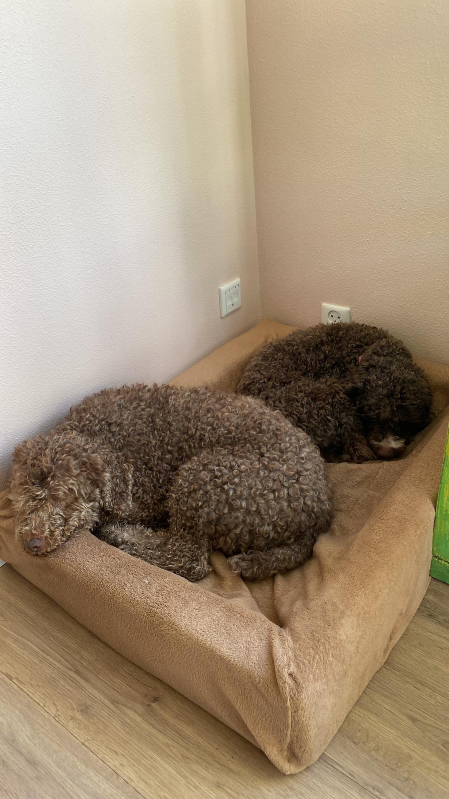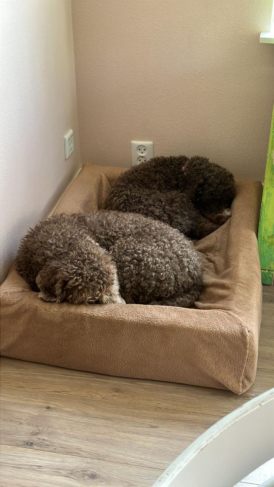 Aangezien Nina de bench is gewend, hebben wij voor haar ook een (grote, 1,20 meter) bench. Om haar een veilig gevoel te geven, hebben wij haar bench deels afgeschermd, 1 zijkant volledig, andere zijkant deels en bovenop volledig. Wij merkten dat Nina graag met haar koppie verhoogd ligt, dus hebben wij een deken opgerold. Alhoewel zij de verhoging heel fijn vindt, vindt zij de bench an sich niet heel fijn. Zij ligt er wel af en toe in als de bench openstaat, maar als de bench overdag dichtgaat, laat zij stresssignalen/onrustig gedrag zien. Zij vertoont dan geen sloopgedrag of mutilatie, maar kan wel piepen en blaffen.