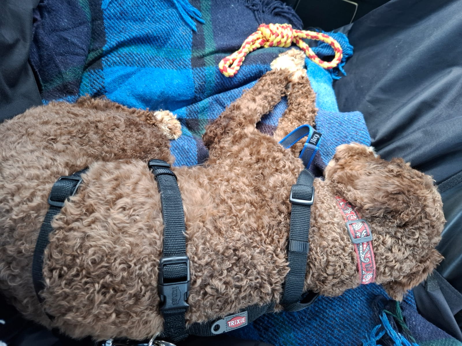 In de auto vindt ze prima, ze is rustig en gaat liggen.
