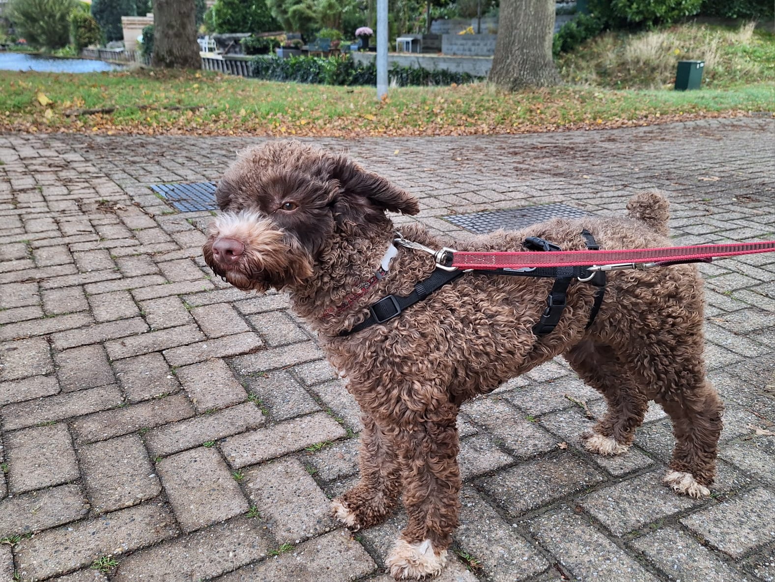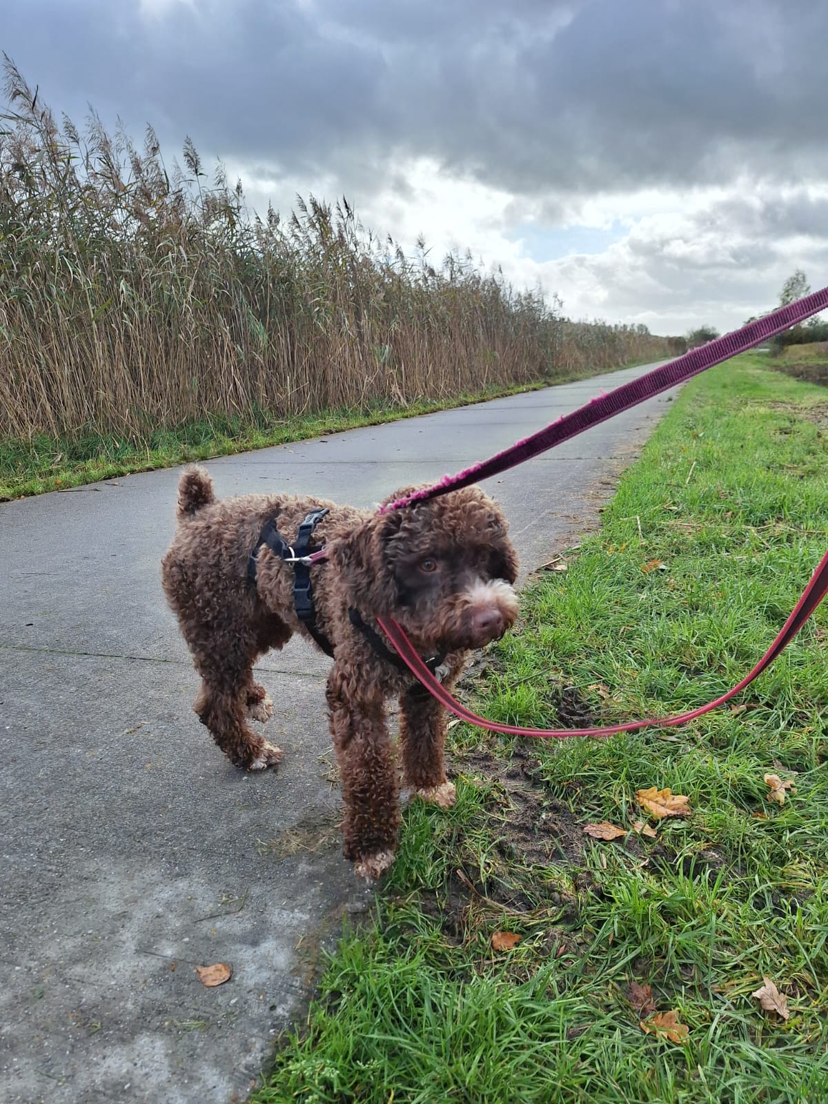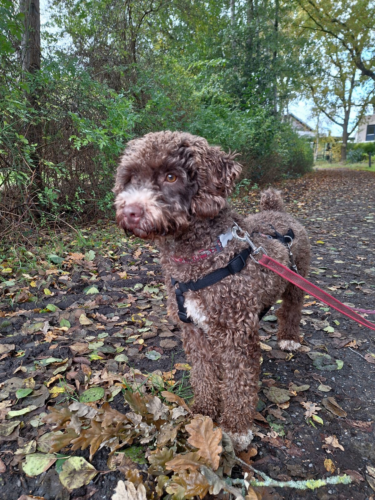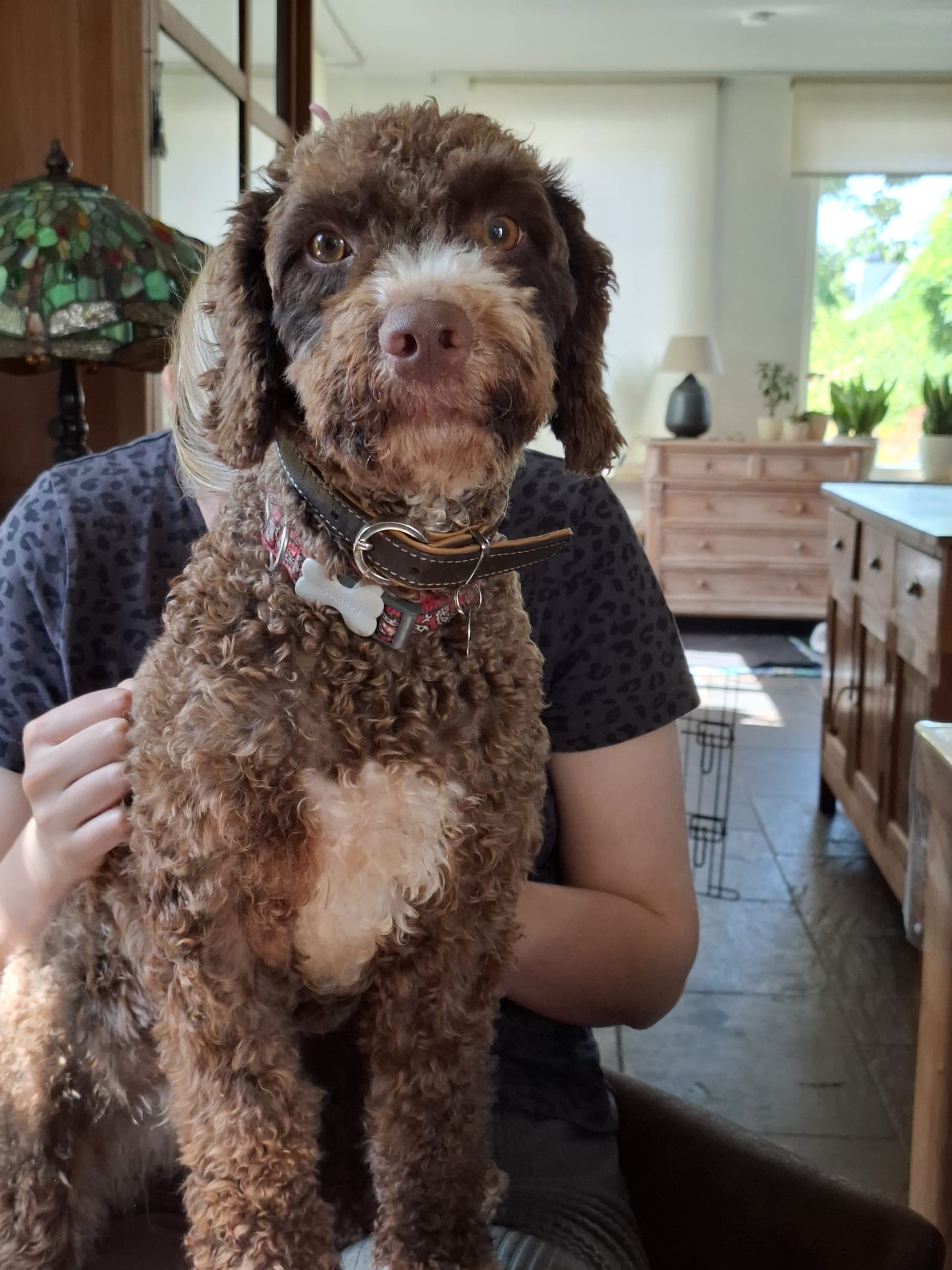 Noa is een kleine, hele lieve en vrolijke, prachtige chocoladebruine Spaanse waterhond van bijna 2 jaar. Maar ze gedraagt zich vaak nog als een puppy. Ze heeft veel energie en is superslim en wil graag dingen leren. Ze is klein van stuk, ze weegt 12 kilo en is ongeveer 45 cm hoog. Ze heeft een mooie krullende vacht met weinig onderhoud, alerte ogen en is altijd in voor een spelletje. Ze vindt het heerlijk om bij je op de bank of stoel te liggen en wordt graag geknuffeld. Apporteren vindt ze heel erg leuk om te doen en ook hersenwerkspelletjes. Dat snapt ze meteen. Botten kauwen doet ze ook graag en rennen door de tuin vindt ze heerlijk.  Zij is waaks maar dat duurt maar even, met aandacht is ze snel af te leiden. Ze waarschuwt als goede huiswacht.