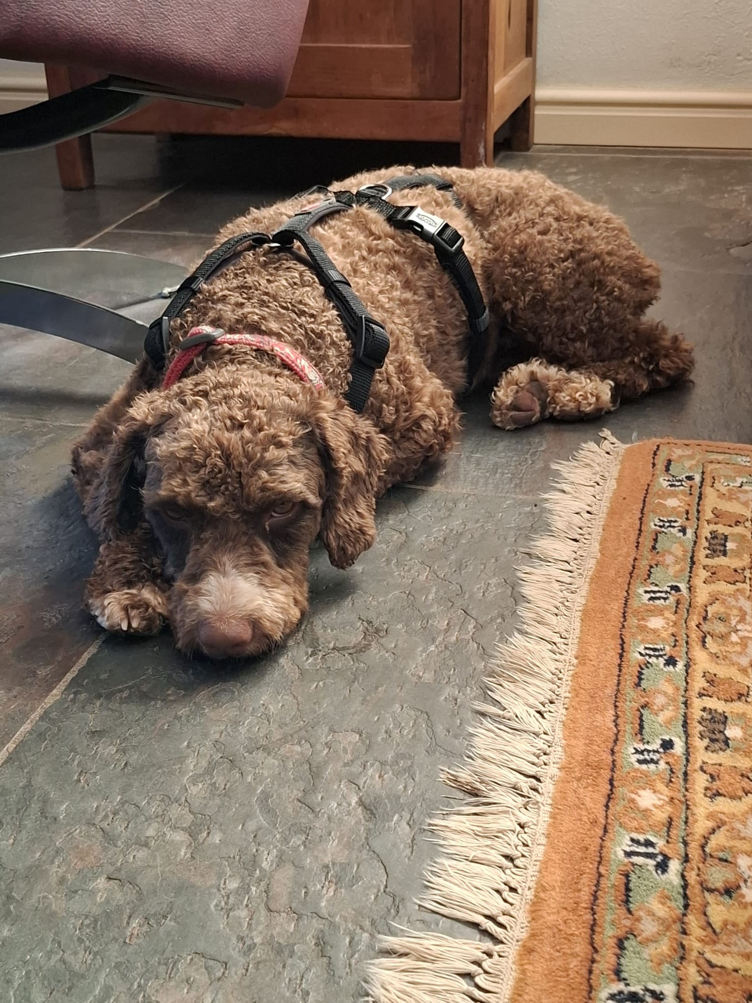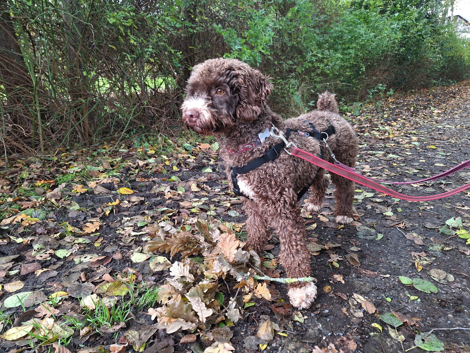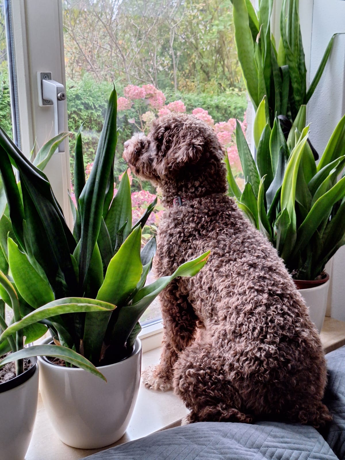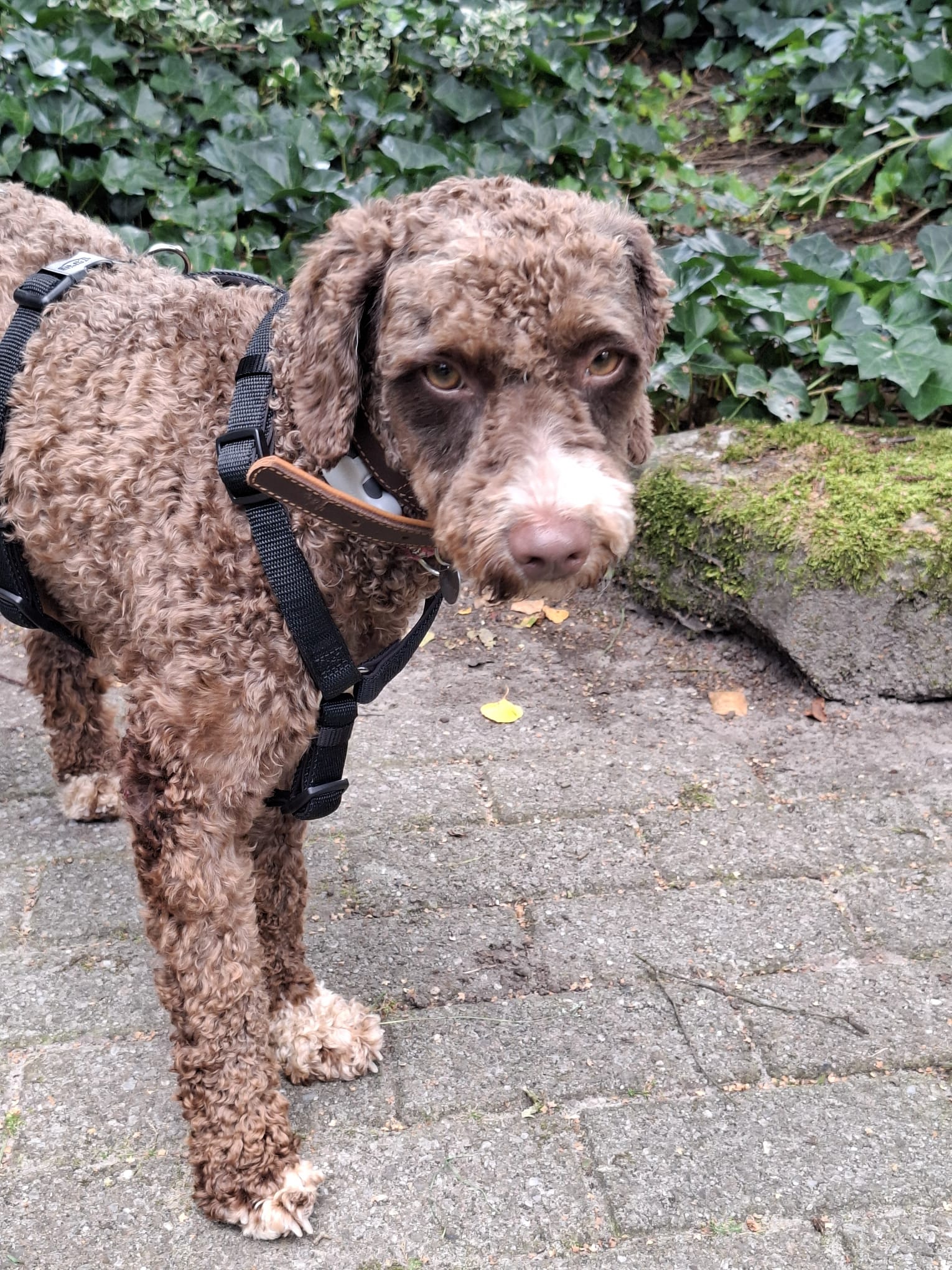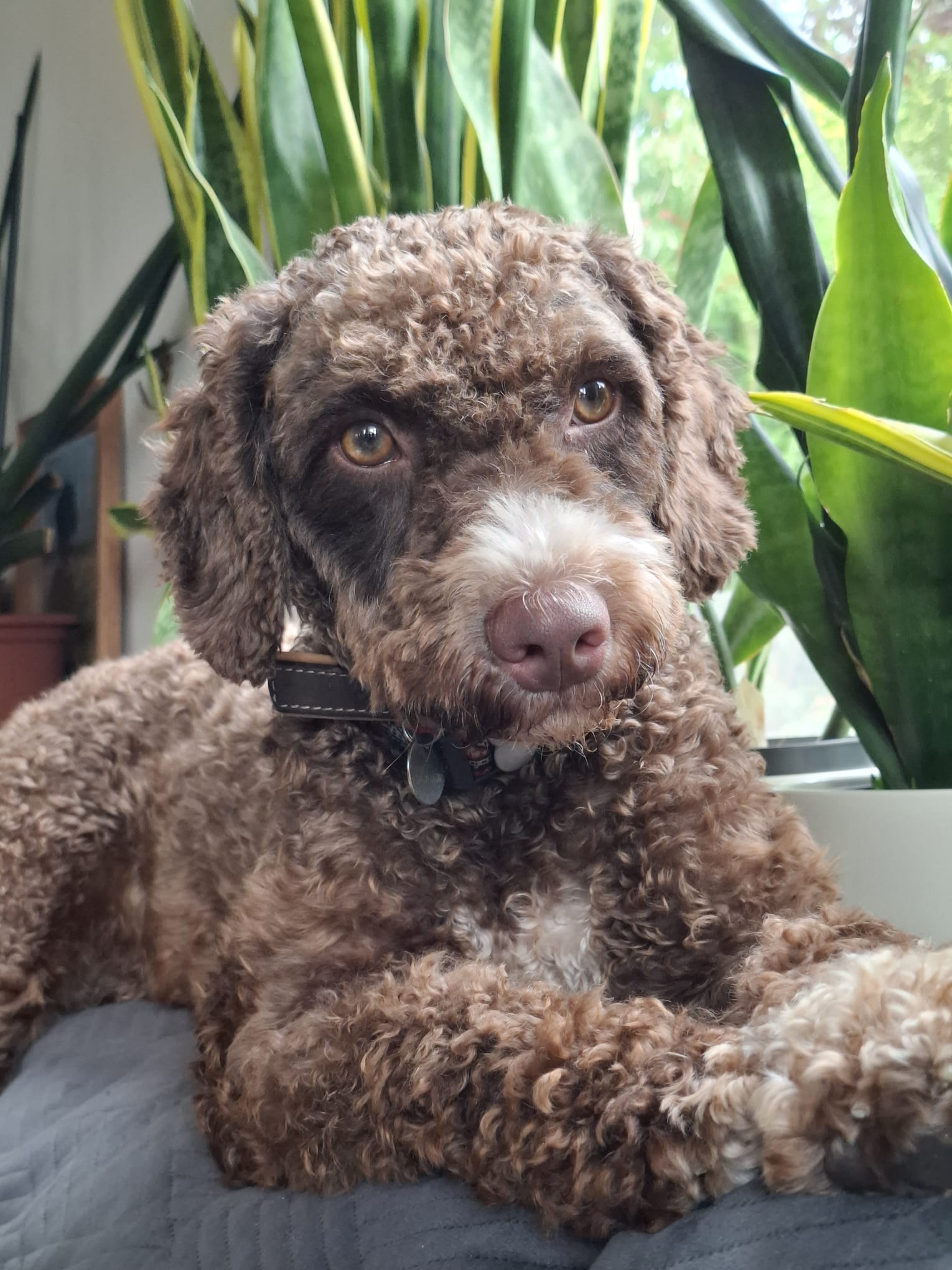 Noa is een kleine, hele lieve en vrolijke, prachtige chocoladebruine Spaanse waterhond van bijna 2 jaar. Maar ze gedraagt zich vaak nog als een puppy. Ze heeft veel energie en is superslim en wil graag dingen leren. Ze is klein van stuk, ze weegt 12 kilo en is ongeveer 45 cm hoog. Ze heeft een mooie krullende vacht met weinig onderhoud, alerte ogen en is altijd in voor een spelletje. Ze vindt het heerlijk om bij je op de bank of stoel te liggen en wordt graag geknuffeld. Apporteren vindt ze heel erg leuk om te doen en ook hersenwerkspelletjes. Dat snapt ze meteen. Botten kauwen doet ze ook graag en rennen door de tuin vindt ze heerlijk.  Zij is waaks maar dat duurt maar even, met aandacht is ze snel af te leiden. Ze waarschuwt als goede huiswacht.