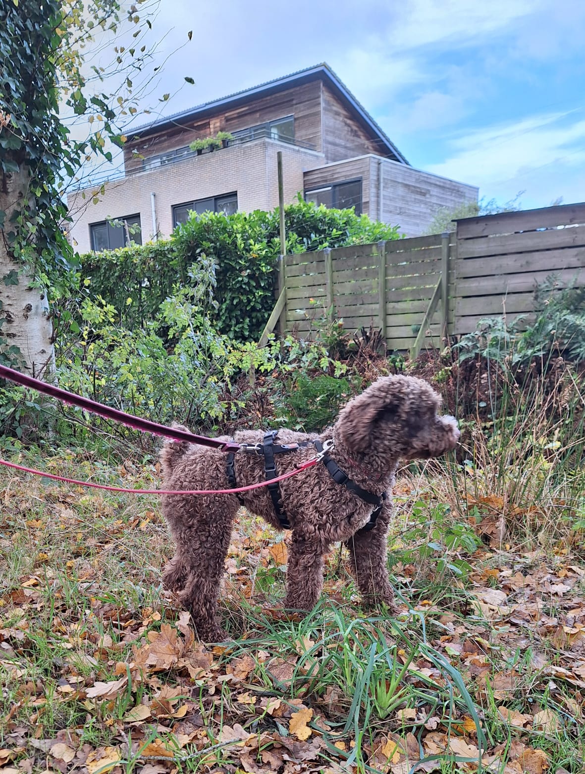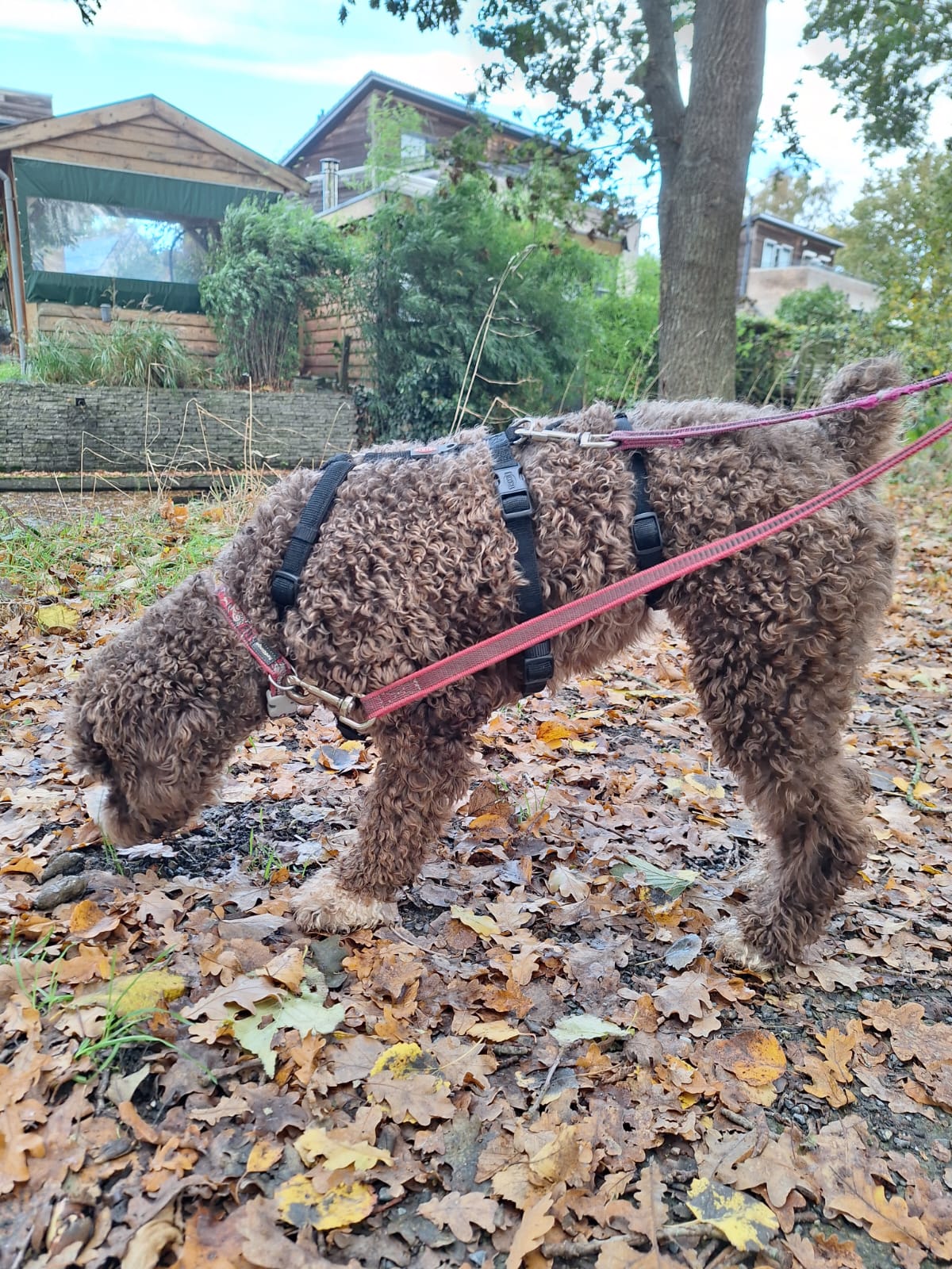 Wandelen en snuffelen geniet ze van. Vogels kijkt ze na, die vindt ze heel interessant, maar ze gaat er niet achteraan. Vanaf de bank kijkt ze ook uit het raam naar vogels die ze voorbij ziet vliegen. Katten? Daar blaft ze tegen op straat en wil ze achteraan. Thuis hebben we geen kat(ten). Hoe ze binnen met katten omgaat weten we dus niet Soms schrikt ze op straat van een auto en blaft dan even. Andere honden op straat vindt ze soms nog wel een beetje spannend, maar soms ook helemaal niet. Kleinere honden vindt ze leuker dan grote honden. Ze heeft bij ons nog niet los gelopen (behalve in de tuin) omdat dat nog niet vertrouwd is. Ze heeft altijd haar driepuntstuig aan en is dubbel aangelijnd.  Tijdens het wandelen doet ze meestal niet haar behoefte, dat doet ze na de wandeling in de tuin.  Soms doet ze haar behoefte wel tijdens de wandeling, dat zal een kwestie zijn van tijd voordat ze dat meer gaat doen. Of ze in Spanje uitgelaten werd weten we niet, waarschijnlijk was ze gewend haar behoefte in de patio te doen?  Ze is volledig zindelijk in huis, ze wordt drie keer per dag uitgelaten en mag daarnaast nog regelmatig de tuin in. Ze geeft het zelf wel aan als ze eruit moet. Ze heeft absoluut een tuin nodig om haar energie kwijt te kunnen en buiten te snuffelen en te spelen.