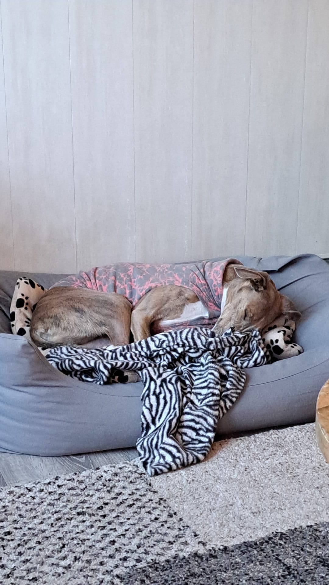 Binnen is Semmie juist heel rustig. Ze ligt graag languit op de bank of in haar mand en is dan de perfecte huisgenoot – kalm, tevreden en aanhankelijk. Ze komt graag lekker tegen je aan liggen om te kroelen. Soms lijkt ze dan bijna een poes: rustig, relaxed en dol op gezelschap.